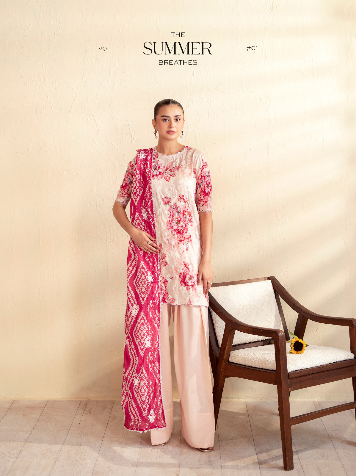 Elevate your warm‑weather wardrobe with this blush pink floral 3‑piece unstitched lawn suit. Featuring a digitally printed shirt, statement contrast dupatta and solid wide‑leg trousers, it’s a perfect summer outfit for festive lunches and day events.